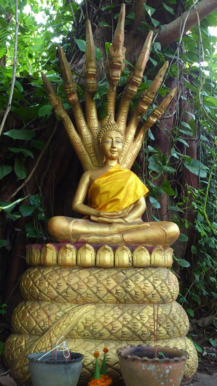 夕方は混むと聞いていたので15時ごろ博物館側から登ってみました。メコン川側の景色、ナムカン川側の景色とも美しくゆっくり眺めることができます。下りは反対側へ下りましたが七頭の龍王に守られた黄金仏や黄金の涅槃仏などが見られます。