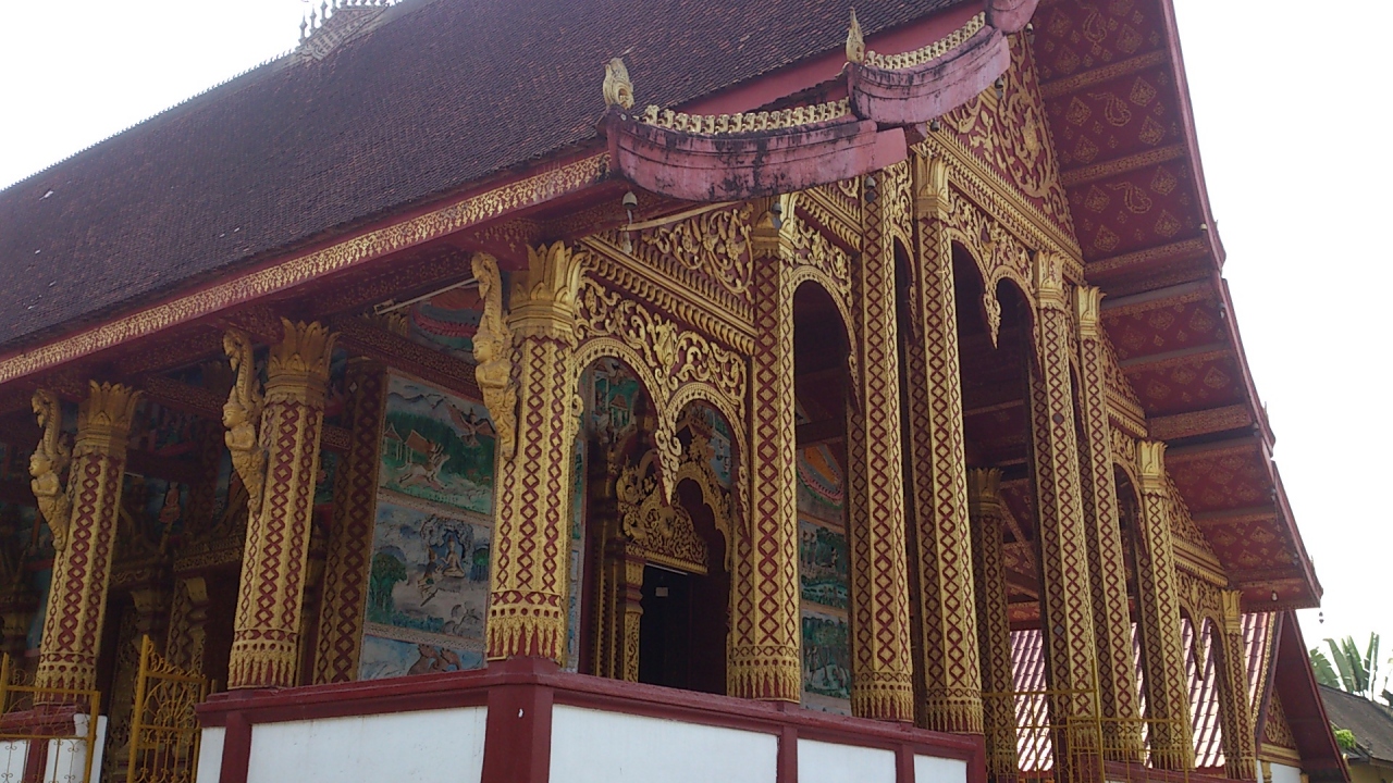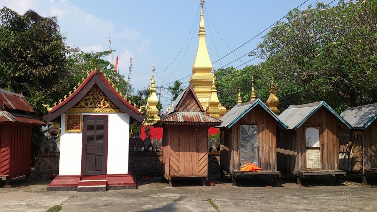 UXO lao ビジターセンターの帰りに寄りました。華麗で威厳もある本堂は中心部の寺院と引けをとりません。ビエンチャンのタートルアンを模した仏塔や懺悔小屋も見ることができます。数人の僧侶も見受けられ、現役のお寺なんだな?と感じました。