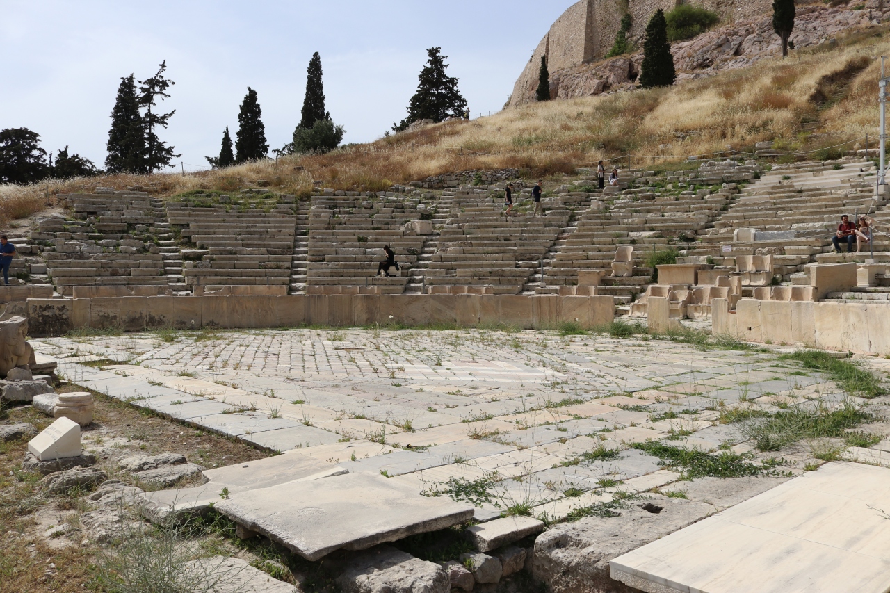 アクロポリスの入り口から一番近いところにある遺跡です。パルテノン神殿がある丘に上がる坂を少し登ったところにありました。思っていたより小さい屋外劇場で、四角に削った石でできた観客席の角度は比較的緩めでした。