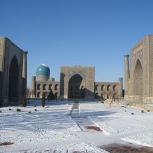 レギスタン広場正面から向かって中央にあるメドレセで、外部よりも内部をお勧めします。天井画は夕闇に包まれた星空のようで、何とも言えない美しさに息を呑みました。