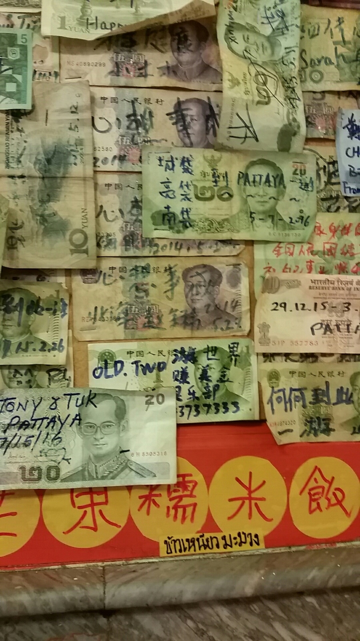 店内は不思議な雰囲気で、天井にはサメがつるされ、壁一面には、メッセージ入りの各国のお札が所せましと貼られています。