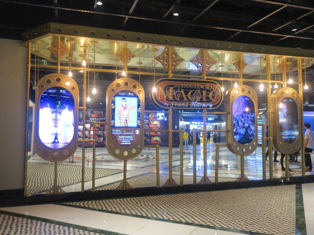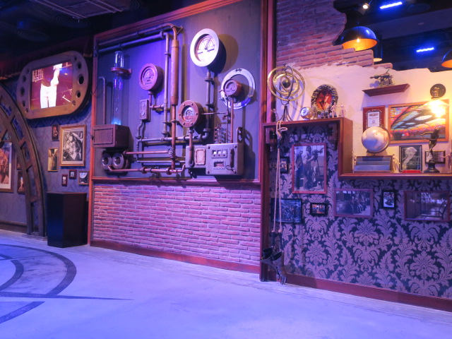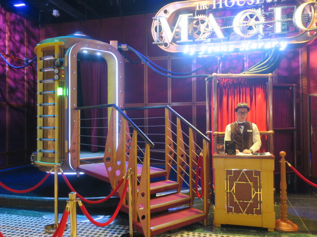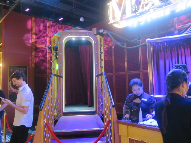 マジックは最初にカプセルに入ったところから始まります。ミラーハウスのような所を抜けると研究室みたいな所に出ます。ここで立ち見の簡単なマジック。