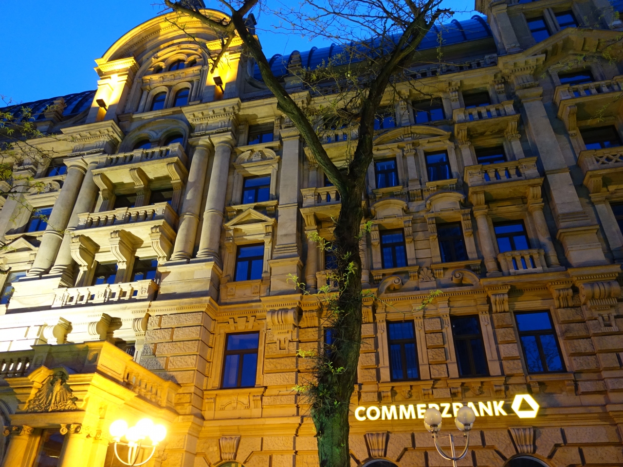 フランクフルトは欧州の金融の中心地だけあり、多くの銀行が社屋を設けています。コメルツ銀行タワーは、石造りの歴史を感じる建物で、夜には間接照明で美しく照らし出されていました。すぐ近くにはユーロタワーもあり、その外観の対比が新鮮でした。