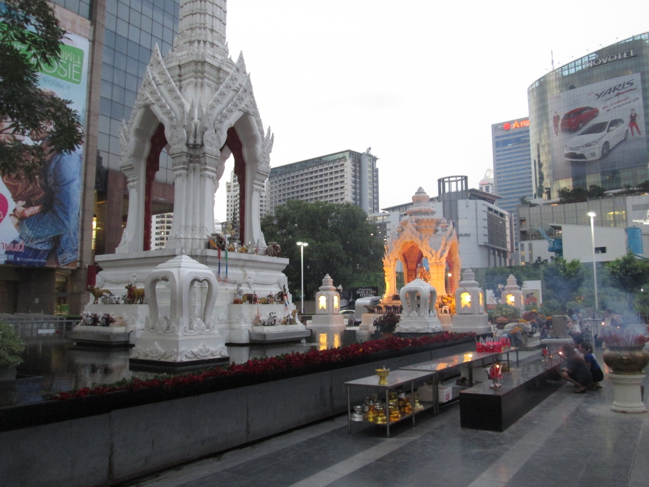 夜になるとガネーシャ像、トリムルティの祠に照明が付き灯り、両像がさらにきれいな黄金色になります。伊勢丹前に位置しているということもあり熱心参拝客が夜になっても続きますが、本当にパワースポットという雰囲気をかもし出しています。