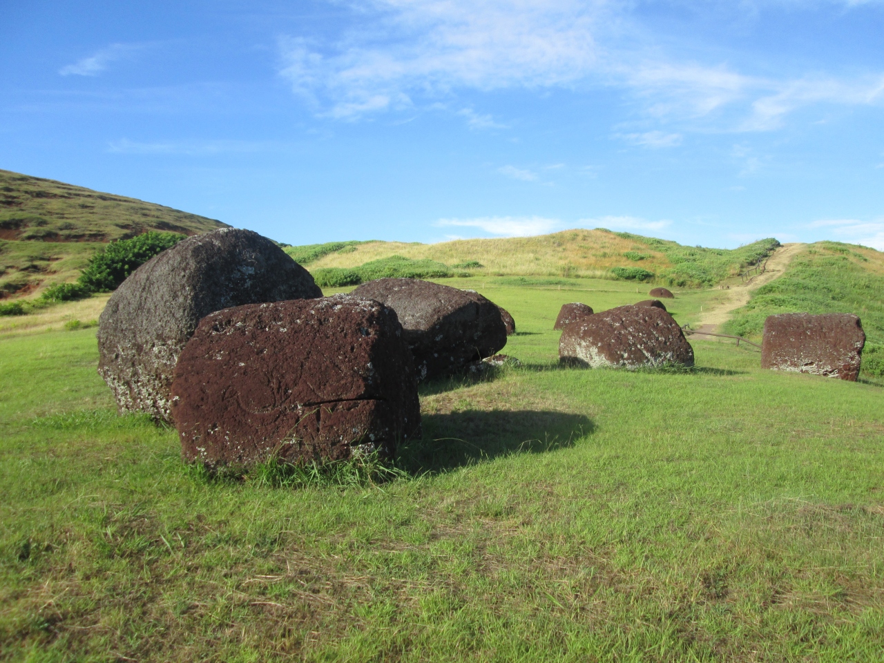 イースター島の中心街・ハンガロア村から比較的近い場所にあります、高台にありますのでハンガロア村の集落など島の様子が見られます、ここにはモアイ像の帽子・プカオの切り出し場所・製造工場があったようで現在もその跡が残っていて石が転がっています、周辺の眺めを楽しみながら歩くといいでしょう。