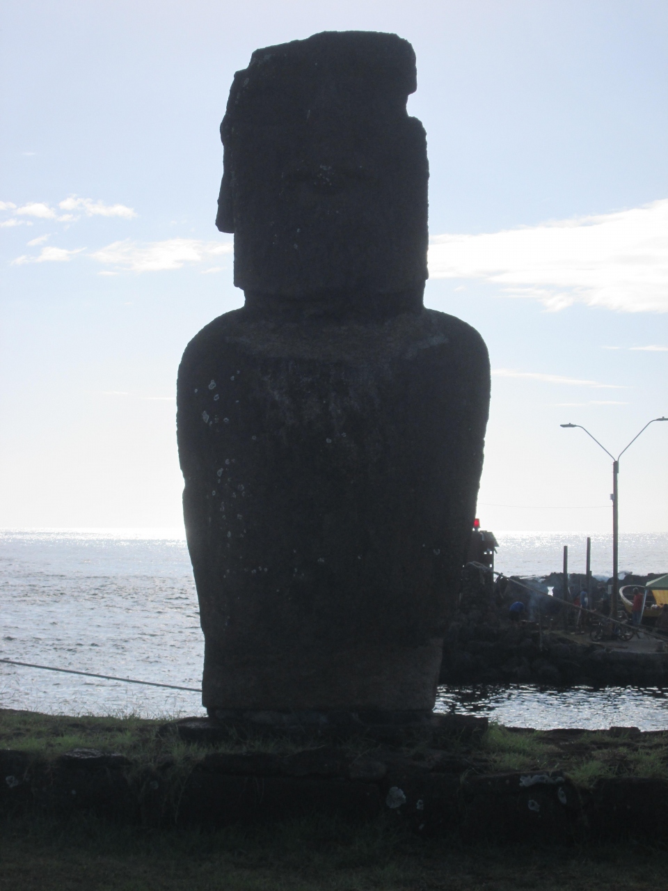 イースター島の市街地・バンガロア村の海岸(ビーチ)沿いにあります、カフェ・レストランが並ぶ、サッカー場の海側前に1体があります、近くに観光用のモアイ像もありました。