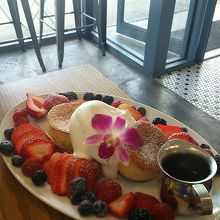 ベリーと生クリームがたっぷりのり、見た目にも可愛らしいパンケーキでした。