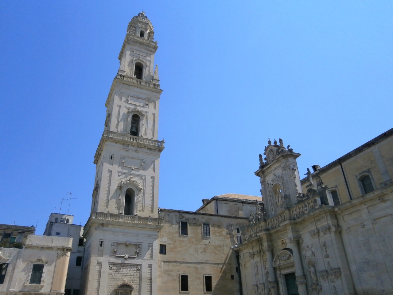 レッチェ駅から旧市街へ10分ほど歩くと、右手にローマ劇場、左手にドゥオーモの鐘楼が見えてきます。ドゥオーモは、もとは1144年に建造された教会で、17世紀中頃に再建されたそうです。鐘楼は5層醸造で高さ70メートル。