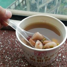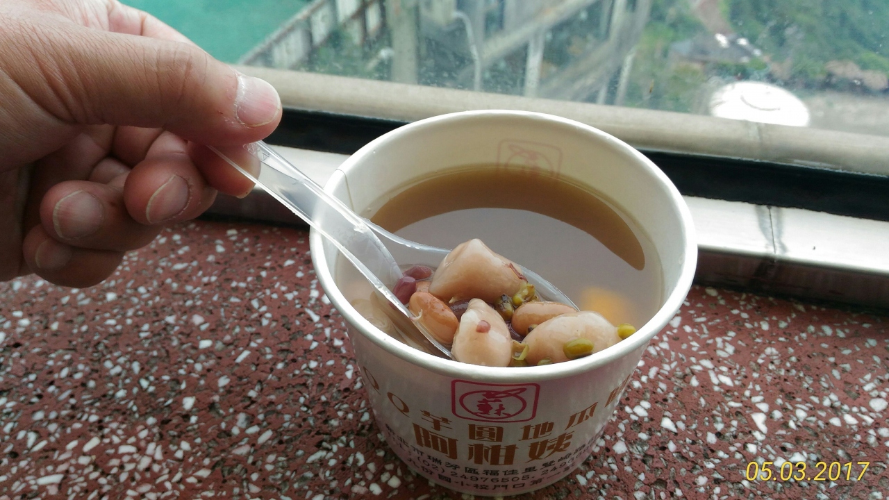 九份に行ったら、芋圓を食べようと思って行きました。甘さ控えめ具だくさんおしるこ、という感じでしょうか。周りの人たちが、買った後に奥の方に入っていくので、ついて行ってみると、眺めのよいイートインスペースがありました。ひとりで一個は、結構お腹がいっぱいになります。