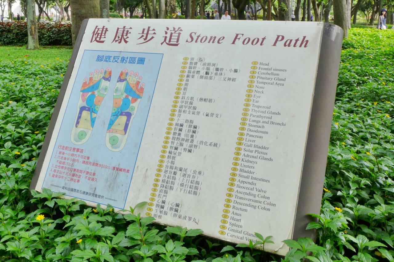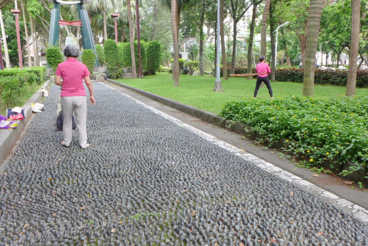 何が健康なのかと思ってよくよく見れば歩道には一面に丸い小石が敷き詰められていて、ここを歩くことにより足つぼを刺激し、健康につながるのだそうです。