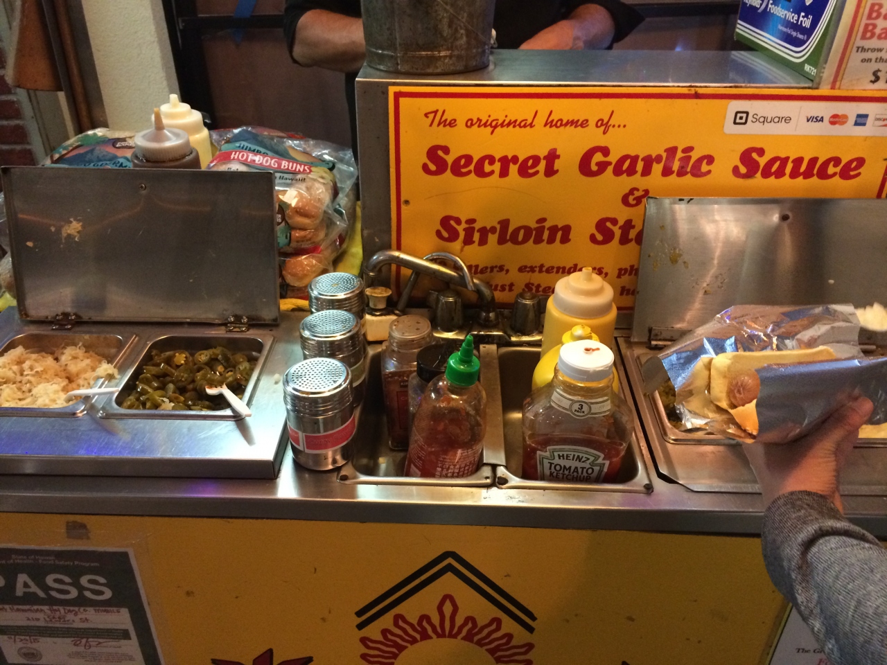 夜になると現れるホットドッグのワゴンです。毎日ではなく曜日が決められているようです。DFSの近くでワイキキの中心にありますが夜に探すのは少し大変でした。ホットドッグはトッピングやソースを選ぶことができ遊び疲れた夜食にぴったりでした。