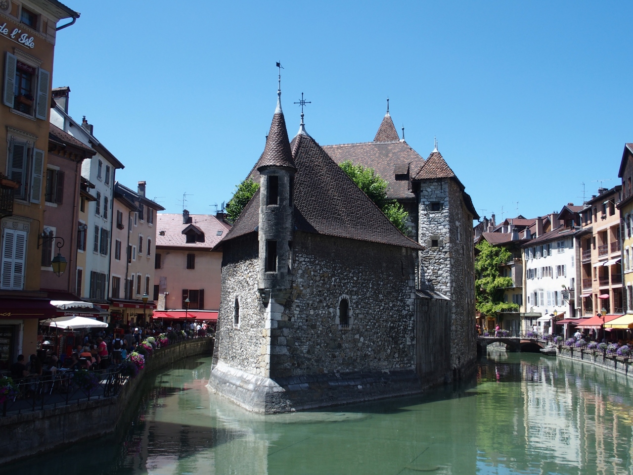 アヌシーの絵葉書やガイドブックには必ず登場する建物です。運河の中に立っており、かつては牢獄だったそうです。絵葉書のような写真は、人通りの多い橋から撮る必要があります。朝早くに行ってみるのがいいかもしれません。夜はライトアップされていました。