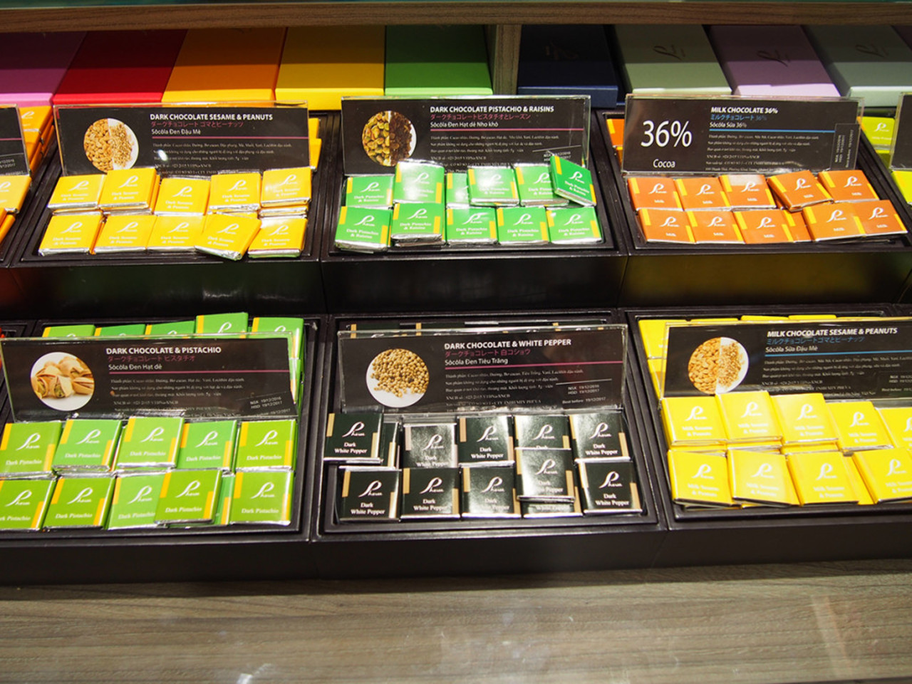 チョコレートは18種類あり、ベトナム産カカオで作られてて、3cm角ほどのサイズで、オシャレでかわいくて美味しいです。