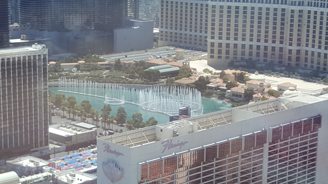 1つのカプセルの中に40人ほど乗れるようで観覧車の中は広々としてました。私が乗ったカプセルは私を含めて4人だけでした。お互いに写真を撮りあったり景色を撮ってるうちに頂上に。ちょうどその時にベラージオの噴水ショーが始まり上から噴水ショーを見ることができました。