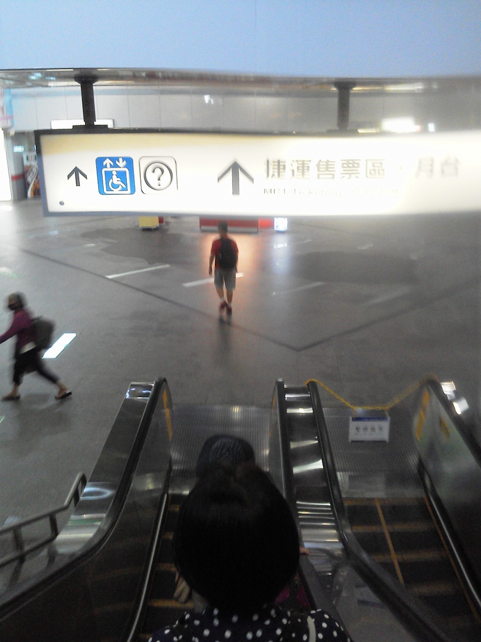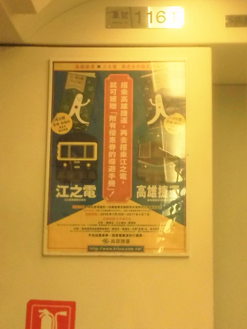 高雄に着いて便利なのは地下鉄(=台北で使える悠遊カード!)を利用することが出来るのです(コンビニ店員さんに聞きました)。街中の行き来に使いました。地下鉄(MRT)の幹線駅では地下3階もあり階段ではムリでエスカレーターを利用しました…EV(♿,ベビーカー,,)は必ず案内がありました;模範的ですネm(_)m 飲食物(ガムも)は禁止!…✖やれやれ座れたで水を飲みましょう✖ あと、面白い掲示を発見!… 高雄捷運と江之電(=江ノ電)がコンタクト(^o^)