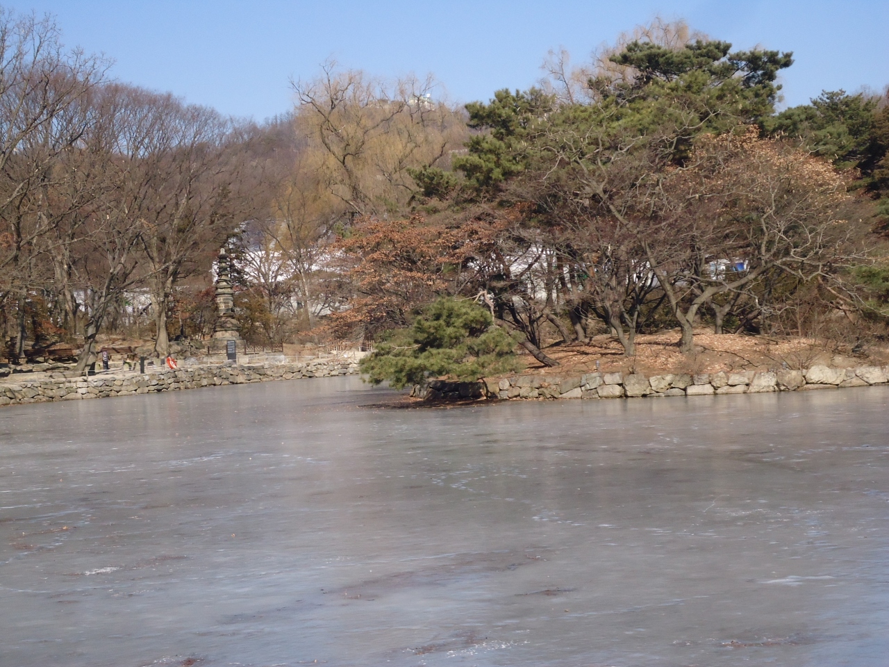 最初は池ではなくて王様が自ら農業試験を行う農地でした。日本の統治自体に池として掘られて姿を変えました。真ん中には小さな島もあって、私が行った時は池が凍っていたので歩いて行けそうな感じがしました。入ることができないから無理ですけどね。