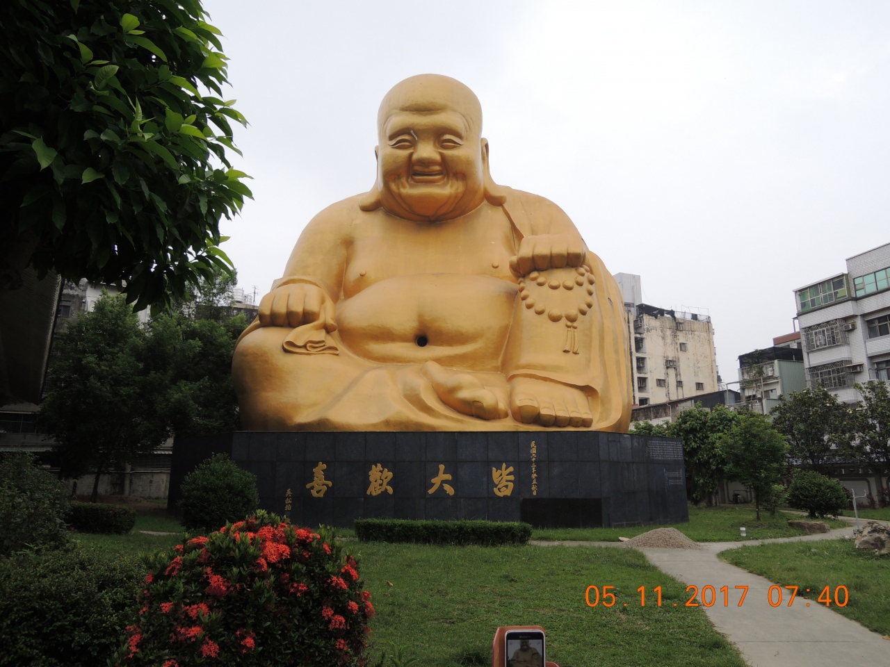 ツアー旅行で台中市内観光として訪れました。にこやかなやさしい顔をした大きな布袋様で金色でした。「笑う門に福来る」のパワースポットだそうです。本堂と金色の大仏様を結ぶ道の脇には、小さな白い弥勒様がゆったりと横たわっていて、なでると金運や開運のご利益があるとも言われるその頭やお腹を私も撫でてきました。皆になでられてツルツルになっていました。