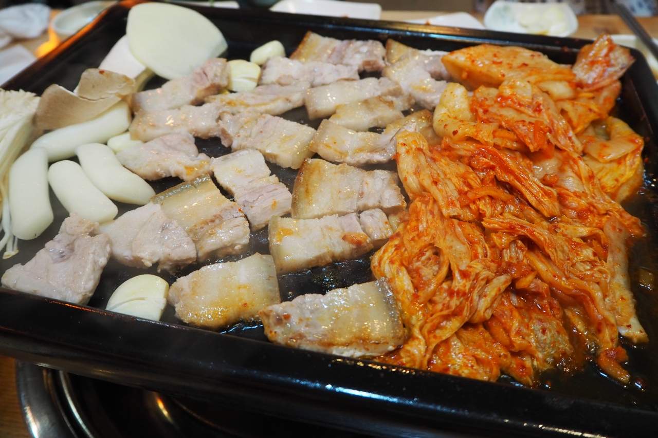 サムギョプサルはサンチュと荏胡麻と焼いたキムチとで、