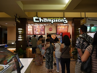 安めのステーキをと思い、以前はフードパントリーの入口近くに有る「ハイステーキ」を良く食べていましたが、今回はロイヤルハワイアンセンター2階の有る「チャンピョンズ」でハーフステーキ・シュリンプを試して見ました。オーダー時に焼き加減を聞かれるのでウエルダン・・良く焼いてくれたが柔らかくて美味しかったです。15%オフのクーポンを利用出来るのでハイステーキより安いくて美味しい、次回からはこちらで決まりです。ちなみに3日後も食べました。