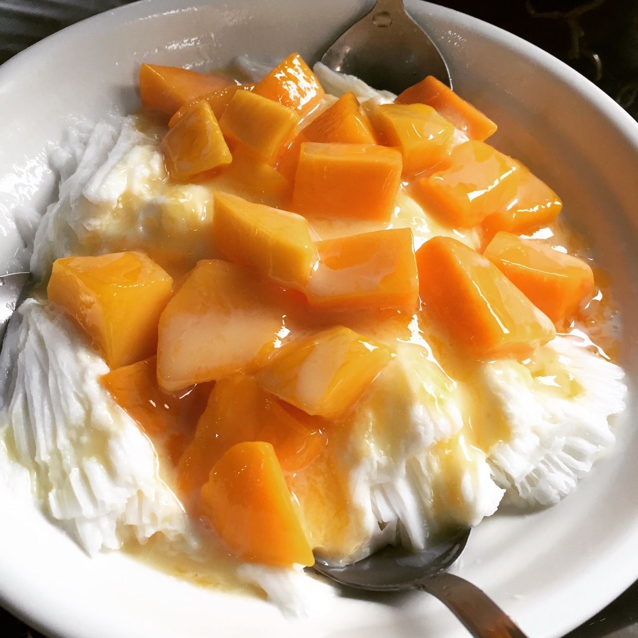 練乳が練りこまれた、細く削られた氷にマンゴーがのっています。絶妙の美味しさでした。