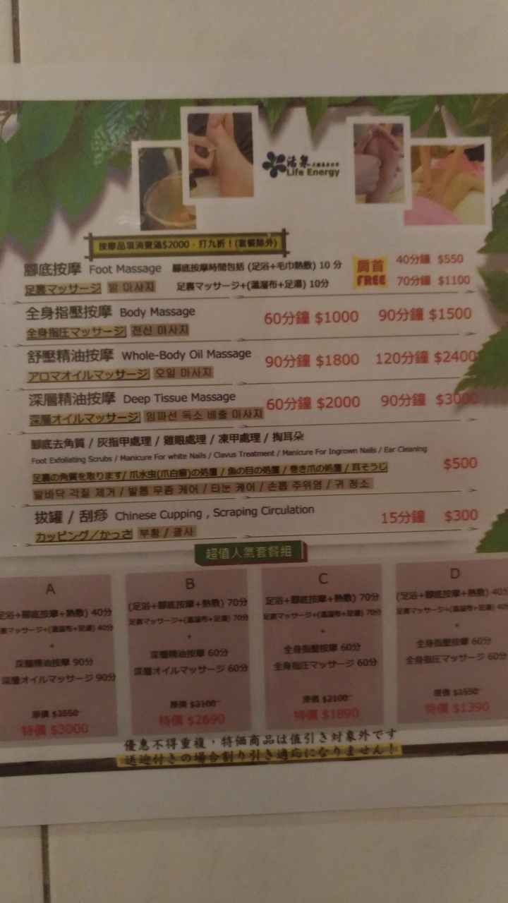 店舗が幾つかあるみたいですが、行天宮近くのお店に行きました。深層オイルマッサージ(リンパマッサージ)と足裏マッサージのセットになったプラン(3,000NTD)を利用しましたが、良くも悪くも大衆的なので、神経質な人にはおススメしません。同性とは言え、胸やお尻をがっしがっし、かなり手荒にマッサージされましたが、腕は確かで、疲れがとれました。