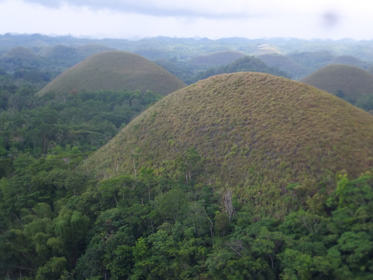 行ったのが月下旬でした。丘は完全な茶色ではなく抹茶チョコレート色でした。乾季の終わりのほうが完全に茶色に代わるとのことでした。多数の小さな丘が続いている不思議な景色でした。展望台があって階段で上りますが、上からのほうが良い眺めでした。し