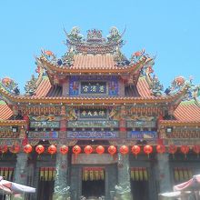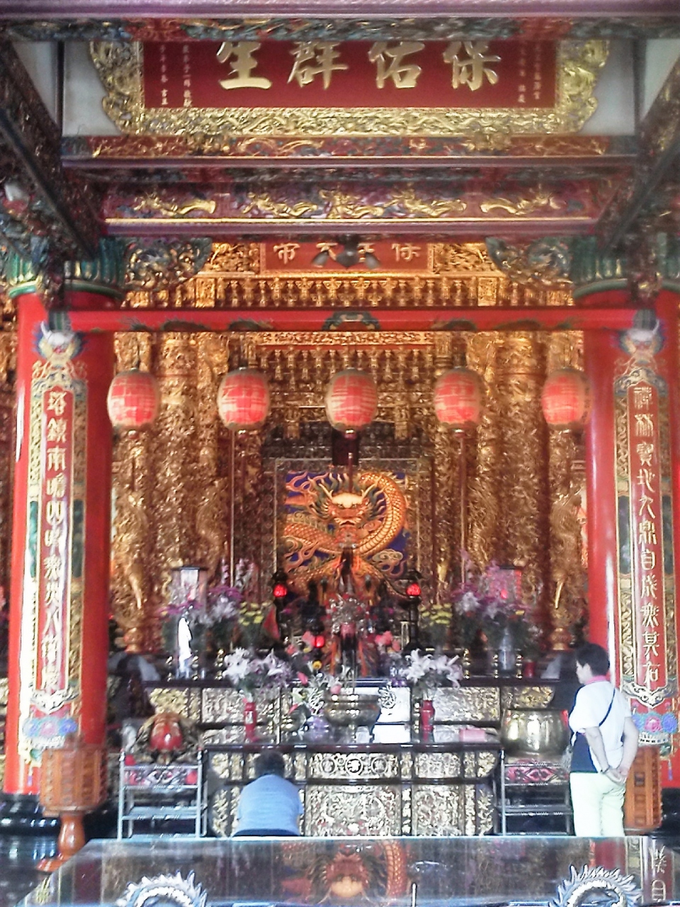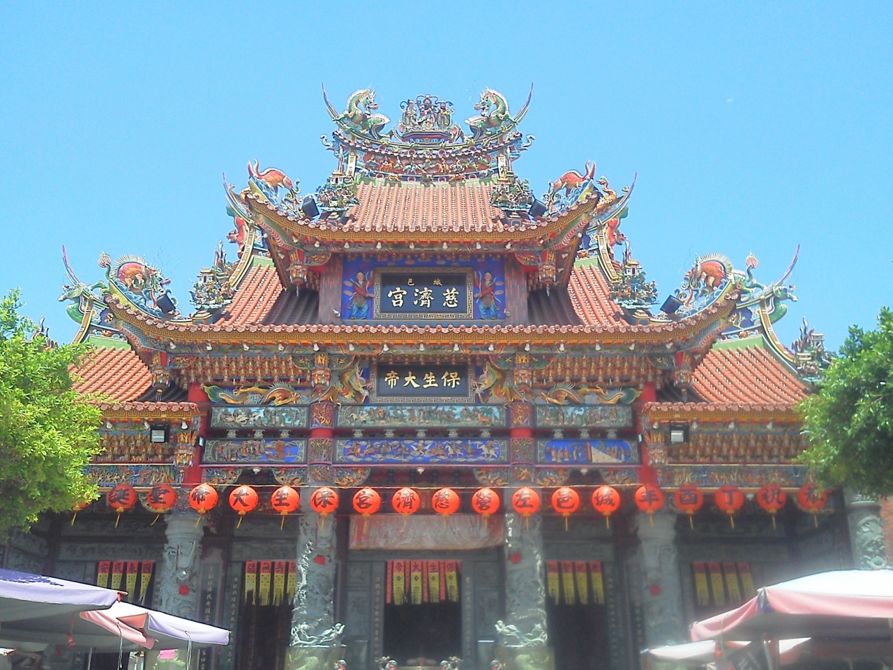 蓮池潭の池に沿って散策しました;龍虎塔⇒春秋閣・五里亭⇒(道を渡り)啓明堂⇒(Uターン)[慈済宮]で着きました。見た目は派手?! 橙色の屋根は(高雄市では)普通ですが、柱/欄間/壁が紺色/水色は珍しいです。それよりも役瓦の新鮮な鯱がもっと目に付きます(^^) `保生大帝`(珍しく読めるのでその場で調べました=お医者さん)で、お祈りしてた女性も真剣でした。 屋台があったので絵葉書(メール便では無く!)を買いました。