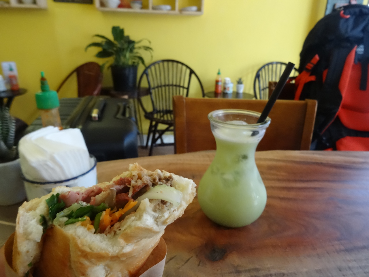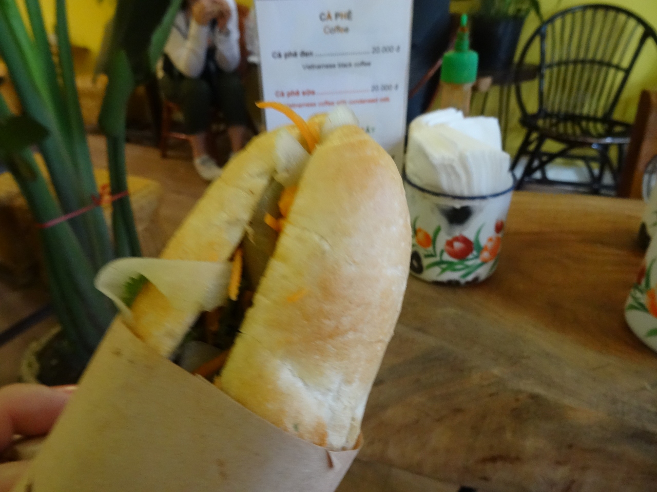 たくさんの種類から選べます。オーダーして一軒隣のカフェで待っていると、持ってきてくれます。フランスパン自体も美味しいし、中身もアジアでしか味わえないサンドイッチの味です。野菜も肉もたっぷりでした。グアバジュースを頼みましたが、あまり甘くなかったですが、フレッシュジュースそのものの味でした。