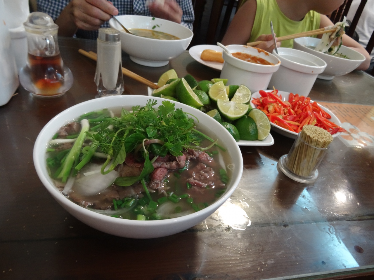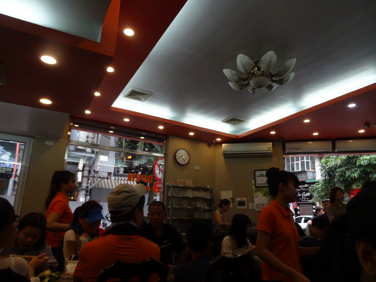 オレンジのテントに人が並んでいるので、すぐわかります。朝から、柔らかい牛肉と香草がたっぷり、美味しいスープのフォーは、1日のエネルギーをくれるかのようです。牛肉が生っぽいのでちょっと嫌だと思っていたのですが、臭みはまったくなく、スープの中で徐々に色が変わっていきます。女性には、かなり量が多いです。混んでいるので相席になりますが、食べたらすぐ出るので、回転はよいようです。