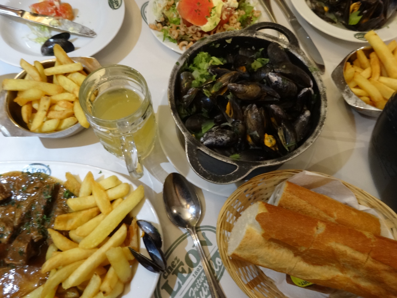 旬の時期では無いからどうかと思いましたが、ムール貝のココット、ビール、トマトと小エビのサラダ、フリッツがセットになったものがお得なようだったので、頼みました。子供のメニューは、オムレツか、スパゲティか、ムール貝から選べ、ムール貝にしましたが、こちらのムール貝でも、通常のムール貝の半人前くらいはあったので、これが無料とは驚きでした。