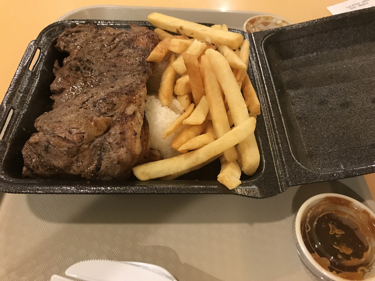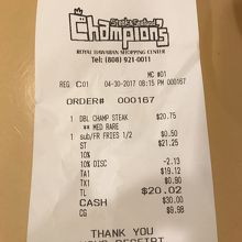 ロイヤルハワイショッピングセンターの二階、目印はトイレの近くにある【チャンピオンズステーキ】。並んだ甲斐があった程、美味しかったです。このボリュームで大人2人で一つ頼みました。レシートに記載してある10%オフは、フリーペーパーに割引券があったので持って行ったら使えました!