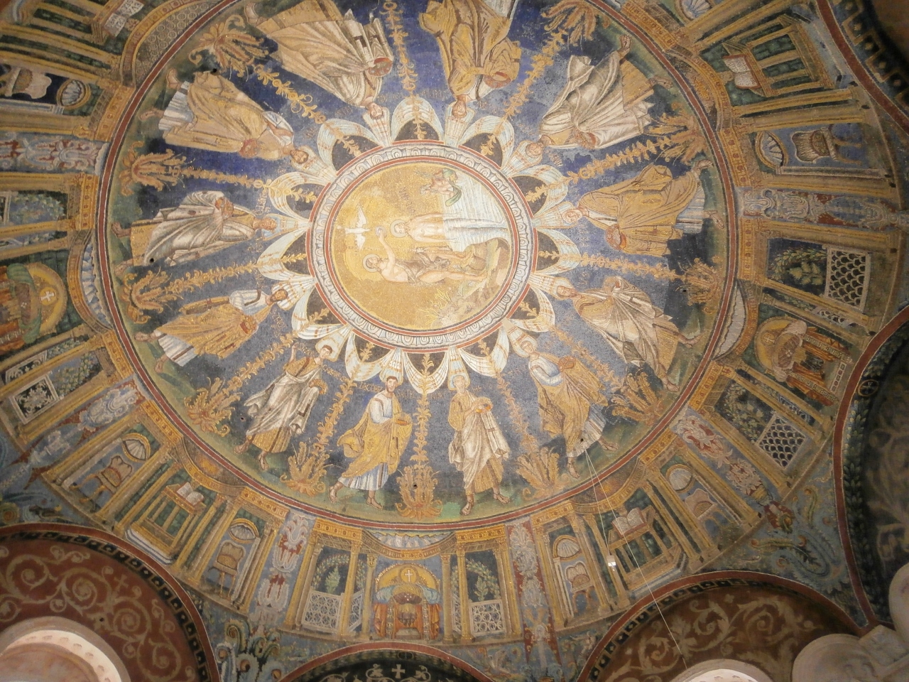 円蓋天井の鮮やかな色彩のモザイクが圧巻です。中央に洗礼を受けるキリスト、その周りに12人の使徒が描かれていました。