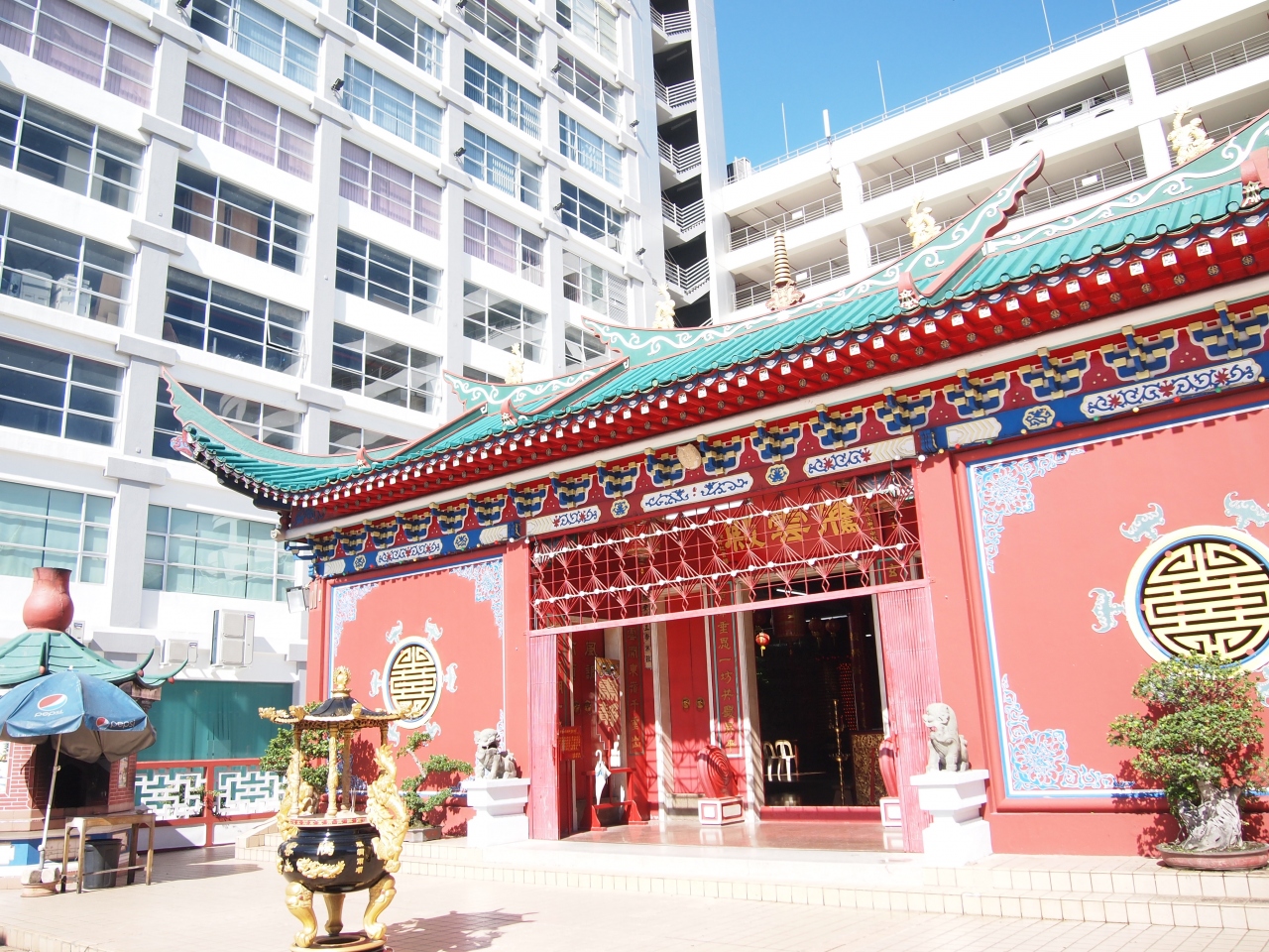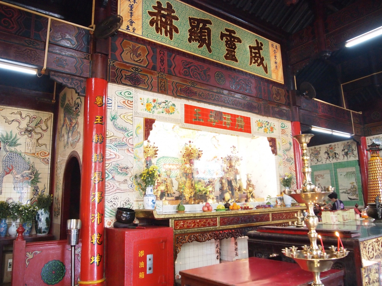イスラム教のゴージャスなモスクばかりが目立つバンダルスリブガワンで、逆にひと際目立つ寺院です。のっぽのビルの陰に佇む小さなお寺ながら、穏やかな空気が漂い、灼熱の昼日中も絶えずお祈りを捧げる人が訪れます。境内にはトロピカルな木々が配置され、壁一面にはまるで4コマ漫画のような(4コマどころでは済まない超大作)の物語が描かれていたりと、コンパクトな中にも見所いっぱいです。誰でも自由に拝観可。