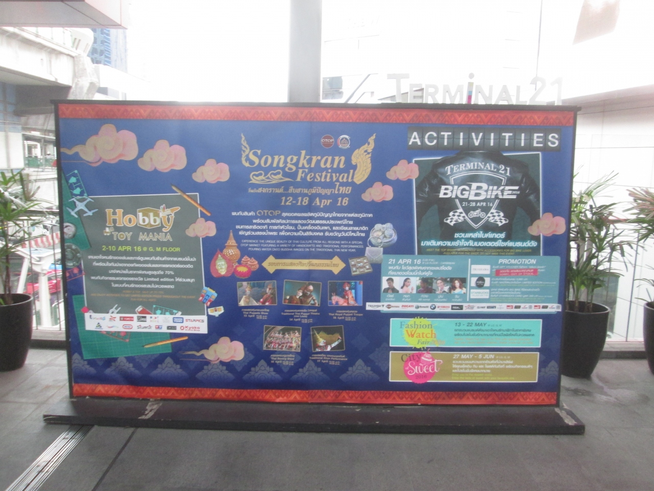 4月はタイ人、国にとって重要な休暇「ソンクラーン」があります。タイにおける旧正月を指しており、政府によって祝日が定められているぐらいです。1年のなかでもっともタイ人の購買意欲が上がる時期のようで、ターミナル21にある各専門店やショップ、スーパーではいつもより割引率を上げて関連セールを行っていました。