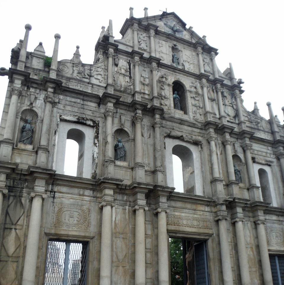 マカオのガイドブックで必ず掲載されている有名観光スポットの聖ポール天主堂跡。1835年の火事で焼失してしまい、今は教会の前壁と階段だけしか残っていません。非常に薄い建物(?)です。後ろから鉄骨で支えているのが見られます。ファザードの彫刻は見事でじっくり見ていくのも面白いと思います。