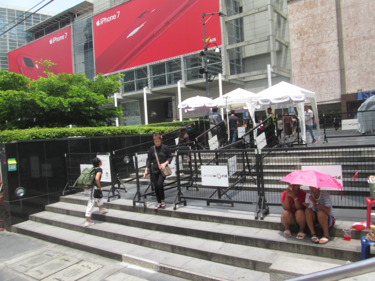 5月にバンコク市内で爆発事件が多発したといこともあり、セントラルワールドの敷地内に入る際、荷物検査がありました。開放的な広場のまわりには柵が設置されて警備が厳しくなっていました。あらかじめ、かばんのジッパーを開けておくとスムーズに通過できました。