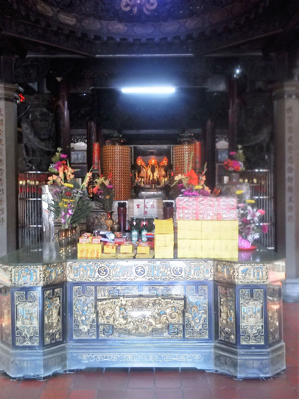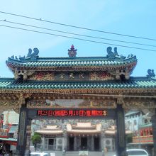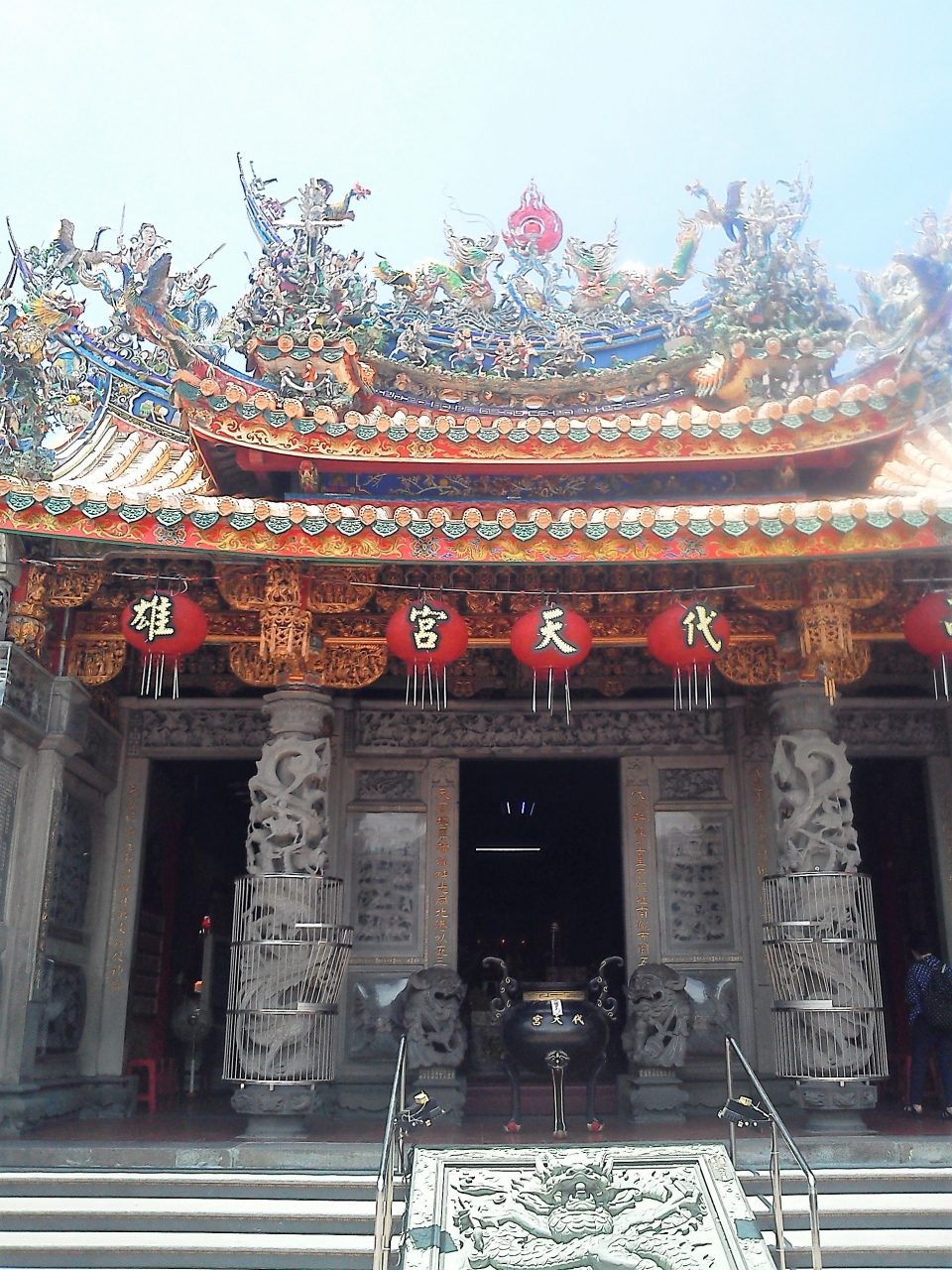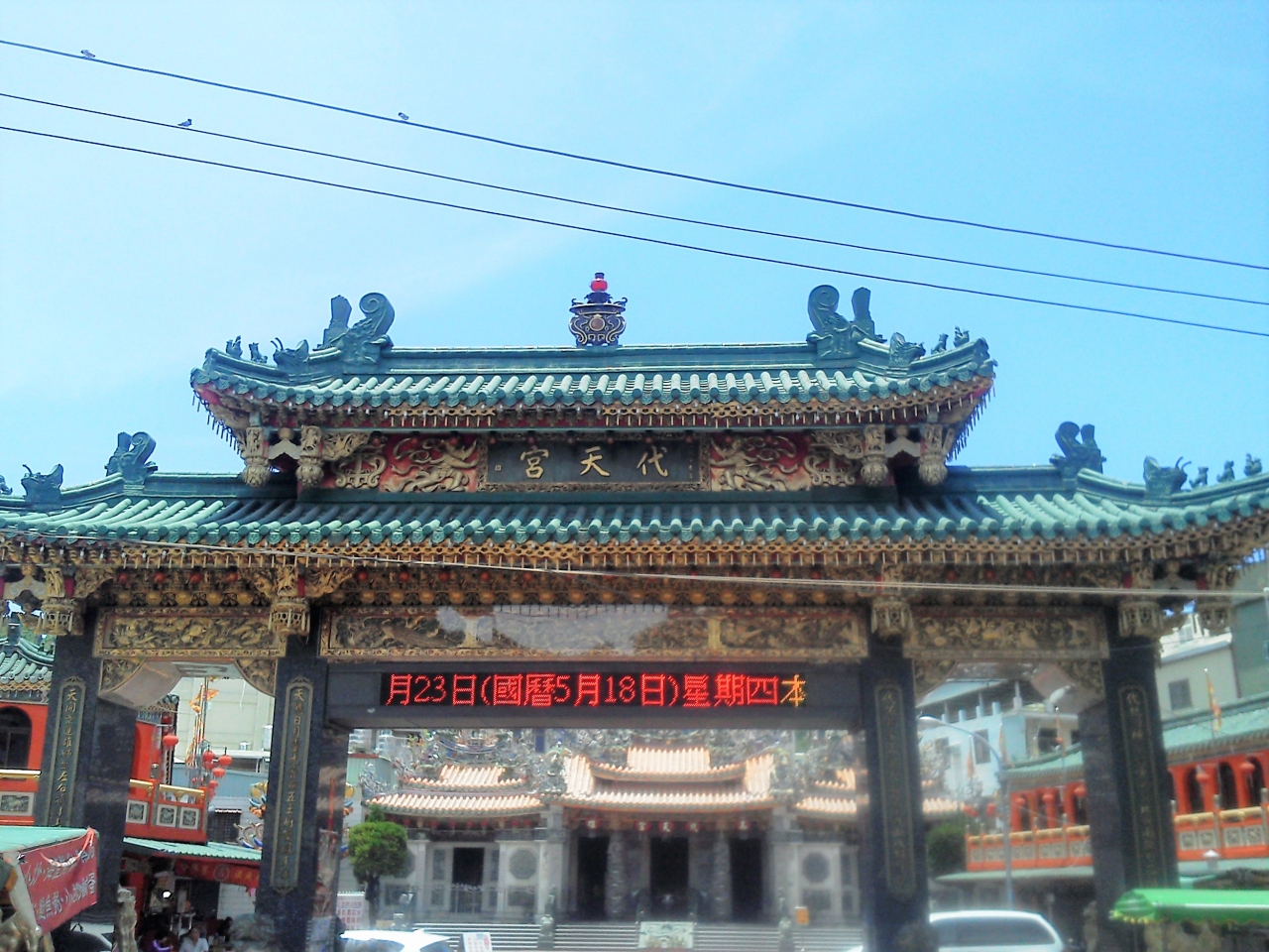昨日は旗津半島に行きましたが、今日はMRT西子湾駅で鼓山地区を見て回ります…駅前から歩いて海辺に行きたいと思っていると(10分前後)廟堂が見えました。大きな山門?;青色の屋根に[代天宮] がはっきり見えました。奥に拝殿がありますので入りました。屋根の飾りは(昨日の旗津天后宮より大きな鯱風が)反り返ってました…日本も台湾も台風がありますが?。拝殿の中は豪華な御霊/地元・観光客もお祈り/一年中の供花と沢山のお供え物,,がありました。台湾・廟堂の大特徴で長所ですね!