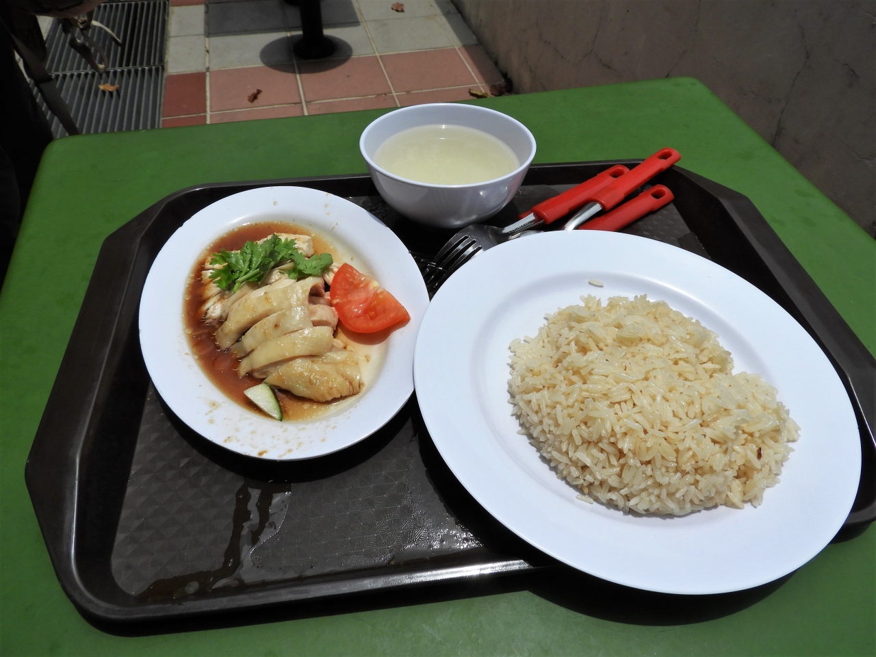やむを得ず外のテーブルで食べました。直射日光ものすごく暑かったけど、目的の結構美味しいチキンライス、これを食べることができました 。