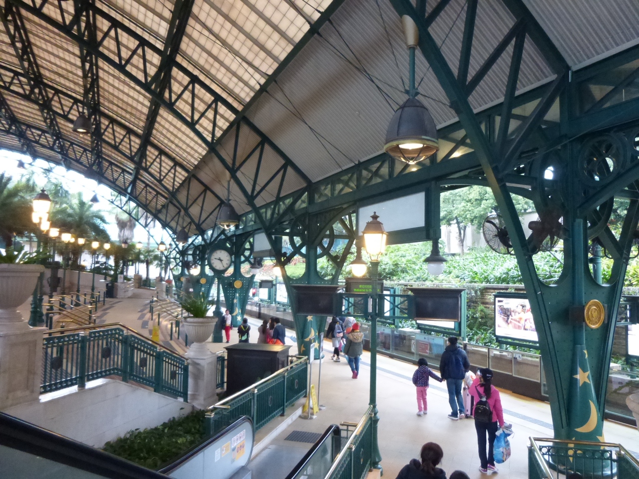 香港ディズニーランドのそばにある駅です。香港のMTRの駅はどこも東京の地下鉄の駅以上に無機質で近代的な雰囲気がしますが、この駅だけは緑が基調のドーム型の作りになっていて、他とは違う楽しげな雰囲気を醸し出しています。旅慣れた方は市内からタクシーを利用するのでしょうが、初心者の私は乗りこなす自信がなかったので、MTRにしました。MTRは混雑もあまりない上に値段も安く、乗り換えもわかりやすいので、初心者向けの交通機関だと思いますが、駅や列車内でもディズニー気分を味わえたので、なおさらMTRにしてよかったと思えました。