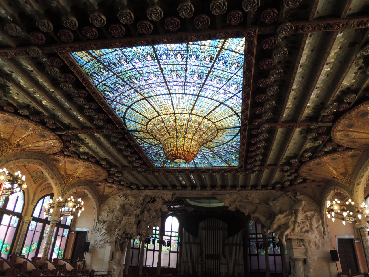 常盤貴子のTVCMでこの音楽堂のことを知り、今回ぜひ行きたいと思って、事前にネットから内部見学ツアーを予約して行きました。日本語のツアーがなかったので英語のツアーで参加。少し高いかなと思いましたが、事前割引が適用されて14.4ユーロ/人でした。バーコード付きのPDFのチケットを印刷し持参。音楽堂の歴史から色々説明を受けながらの内部見学です。一番見たかった天井のステンドグラスは、今までに見たどの建築物のステンドグラスよりも大きく、観客席からは非常に近いので迫力がありました。また、建物の内外を飾る、セラミックで形どられた、花々の彫刻や柱を彩るモザイクも美しかったです。実際に今でも普通に使われている音楽堂のため、自分が行った時には地元の子供の合唱団の練習を見れたのも良かったです。