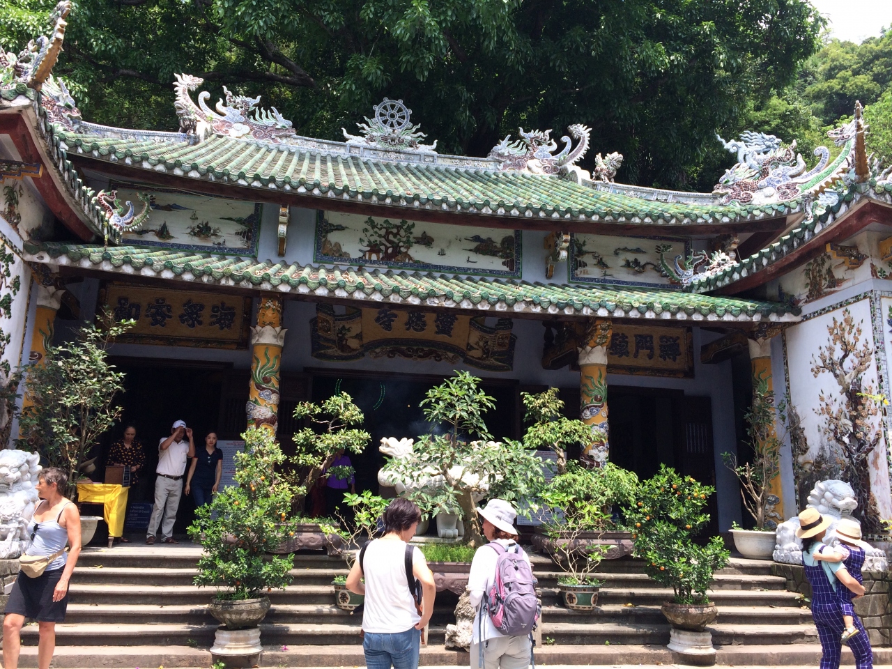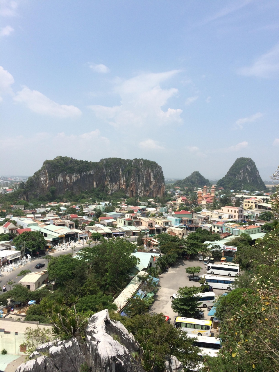 マーブルマウンテンと言わないと通じません。大理石で形成されている山で、ダナンからタクシーで気軽に行ける観光地です。登ってみると、寺院、仏閣、仏像が安置された洞窟、展望台と見るところが沢山あり、山間を歩くと結構疲れます。上りはエレベータ、下りは徒歩で行かれるのをお勧めします。山のふもとには、石仏店、お土産店が沢山あり、石仏を彫っている所も見れますよ。