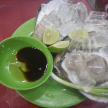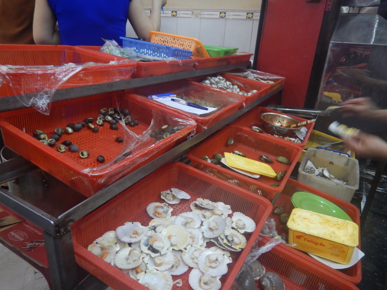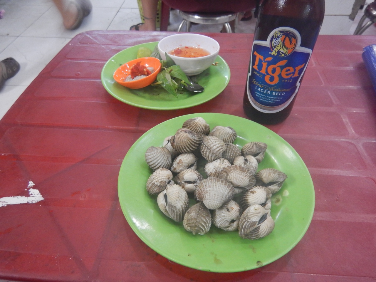 貝料理を2品、赤貝みたいなものを焼いたもの、5万ドン。メニューにオイスターワサビとあったもの1つ3万ドンを2個、タイガービール1万7千ドン2本を注文。赤貝は火が通り過ぎることなく美味しく食べられた。オイスターの方はなんと生。当たったらどうしようと心配しながら食べたが、大丈夫だった。こちらも美味しかった。