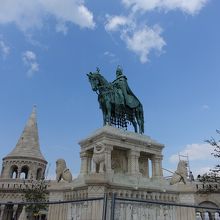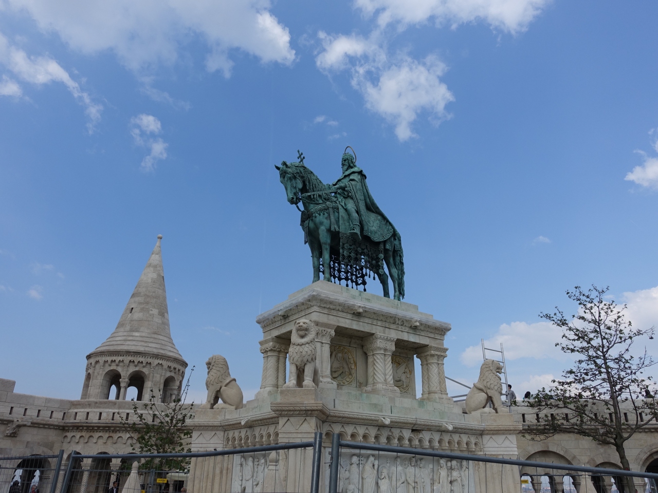 王宮の丘の中心部と言えるマーチャーシュ教会前の広場に設置された見事な騎馬像が「聖イシュトヴァーンの騎馬像」です。全体の大きさも凄いですが、台座部分の大きさや彫刻の精緻さは目を見張るものがあります。青空をバックに写真映えがしました。