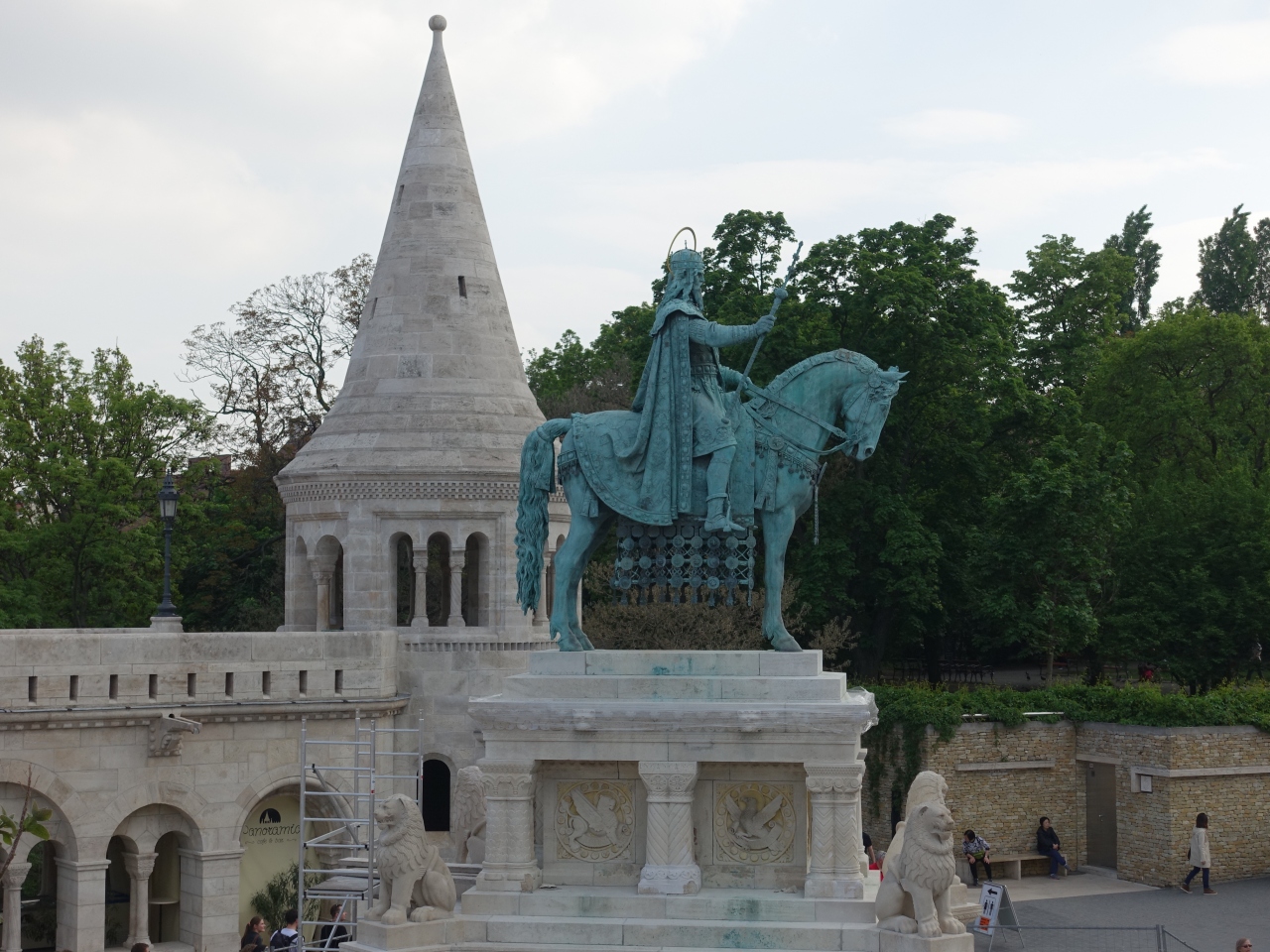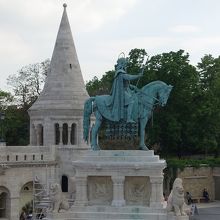 マーチャーシュー教会の近く、漁夫の砦の前に、堂々とした騎馬像が建てられています。ハンガリーの国民から敬愛されている聖イシュトバーンの騎馬像です。四方をライオン像に守られた、きれいな形の銅像です。漁夫の砦の階上に上がると、より、近くに細かいところも見れます