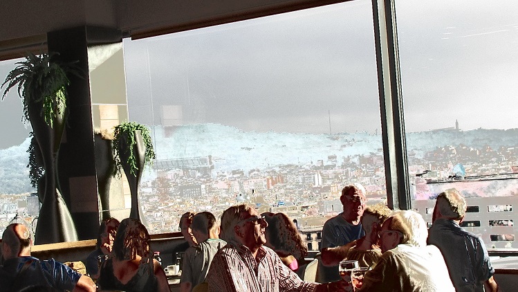 前からバルセロナ空港行のバスが出ています。レストランが眺望よし。