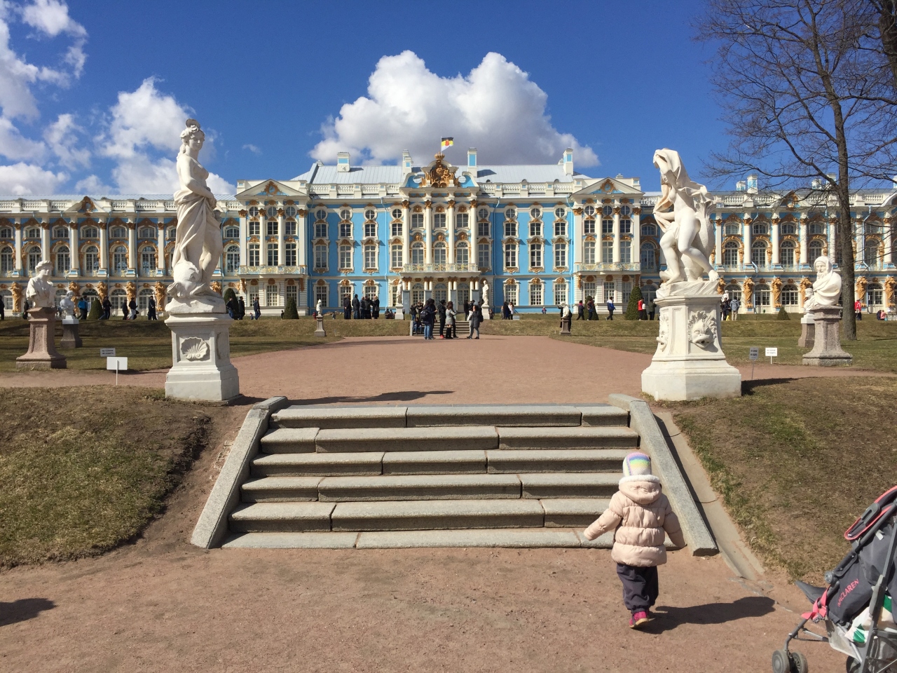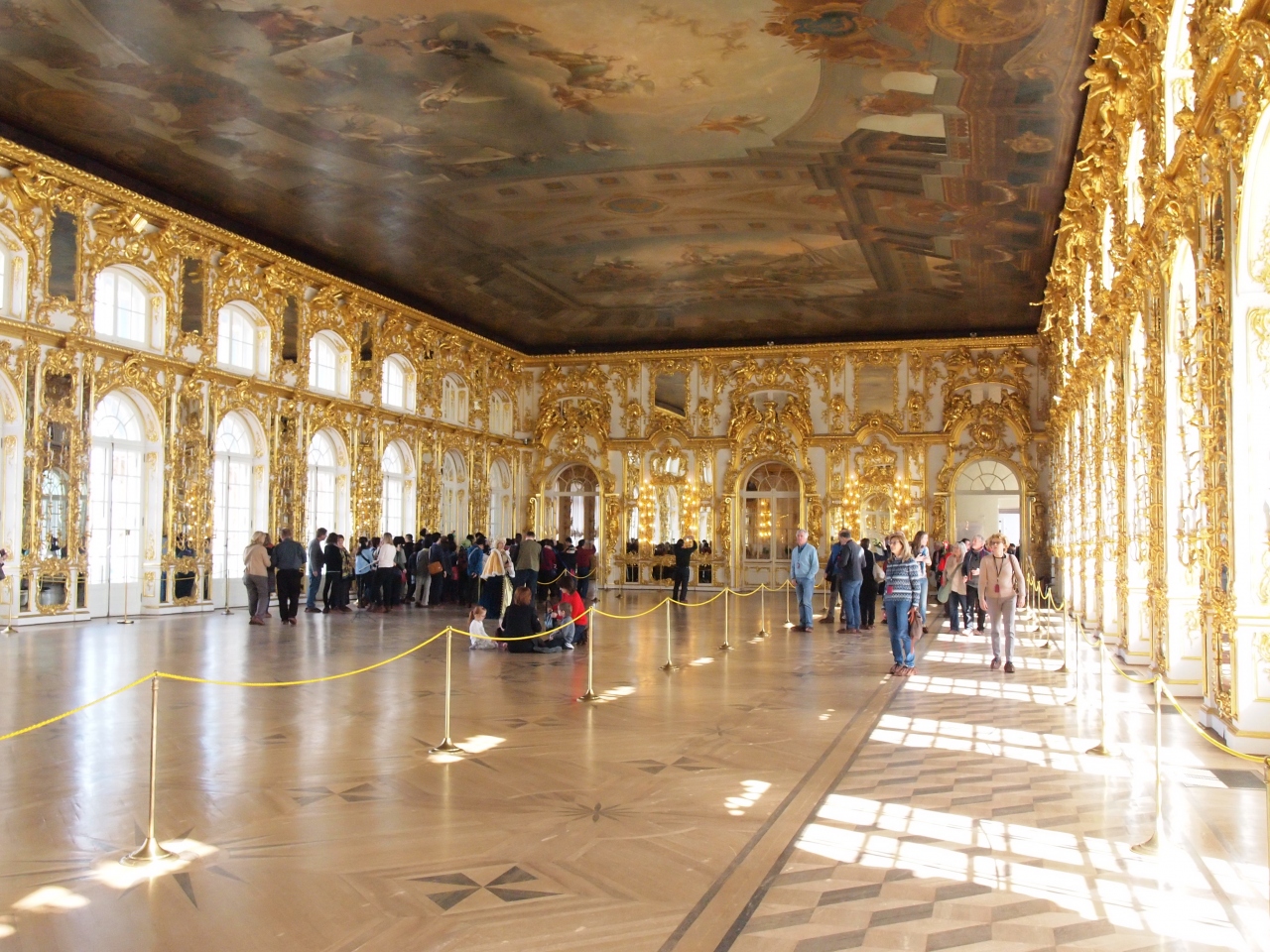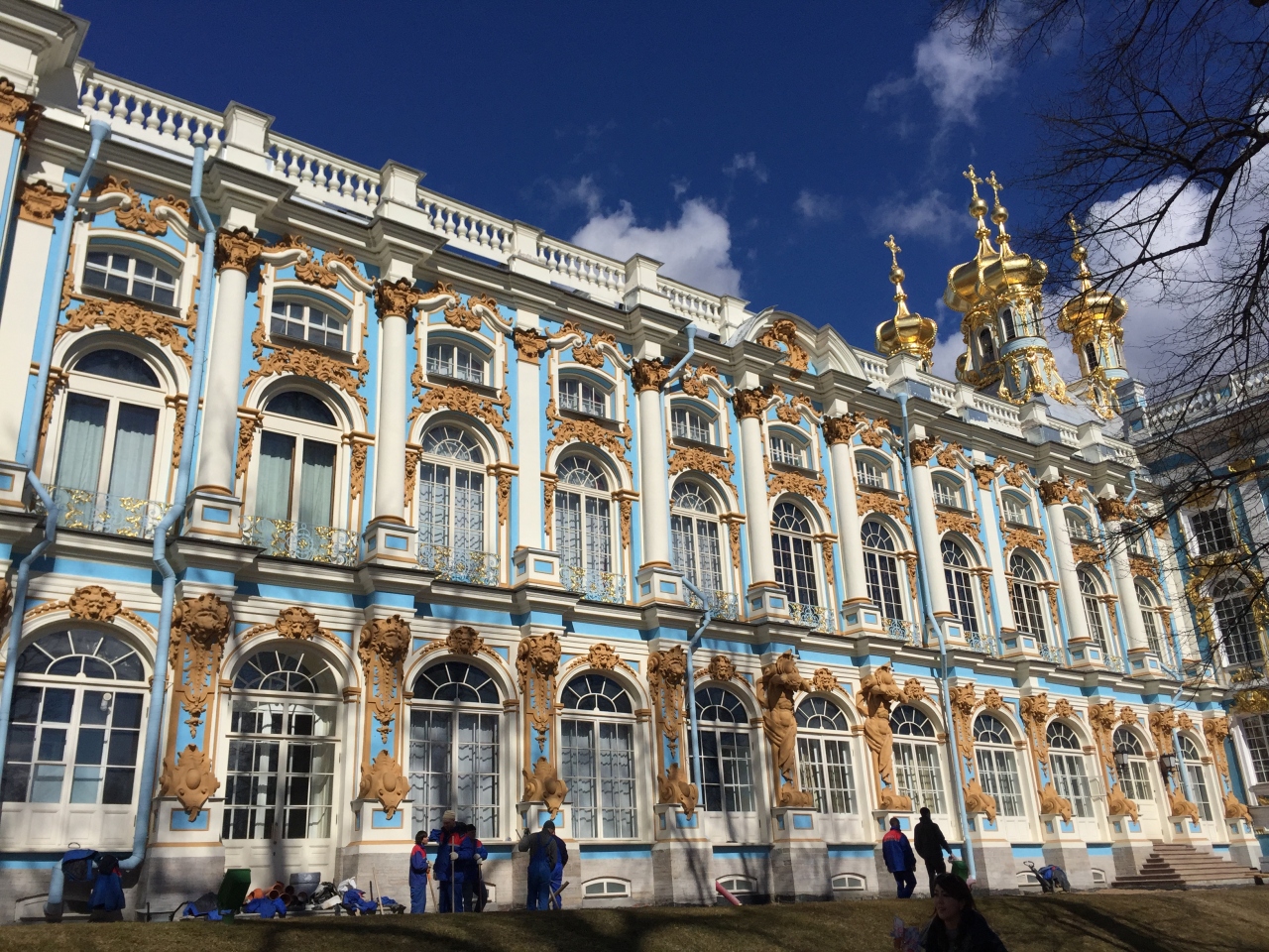 ブルーとゴールドの配色が美しい、巨大な宮殿です。室内も豪華なゴールドの装飾の部屋が連なり眩しい、絢爛豪華な宮殿です。部屋数かとても多く大国ロシアならではの巨大な宮殿です。室内は、靴カバーをして入ります。琥珀の間は、とても迫力があります。撮影禁止です。サンプトペテルブルクからは少しだけ遠いですが、行って良かったと思います。