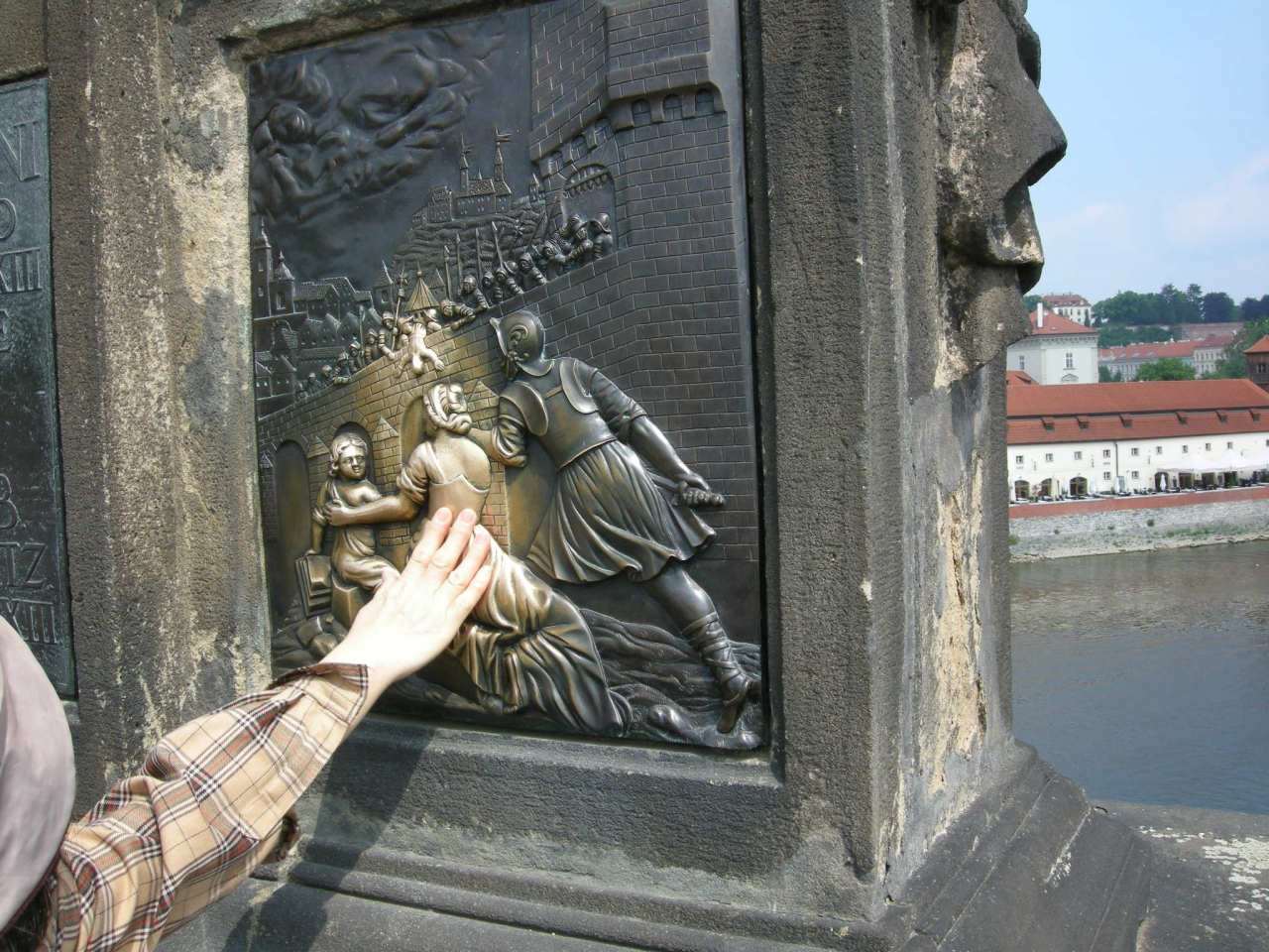台座のレリーフの右側、橋から落とされかけている聖人を触ると幸せになれるという言い伝えがあるそうです。