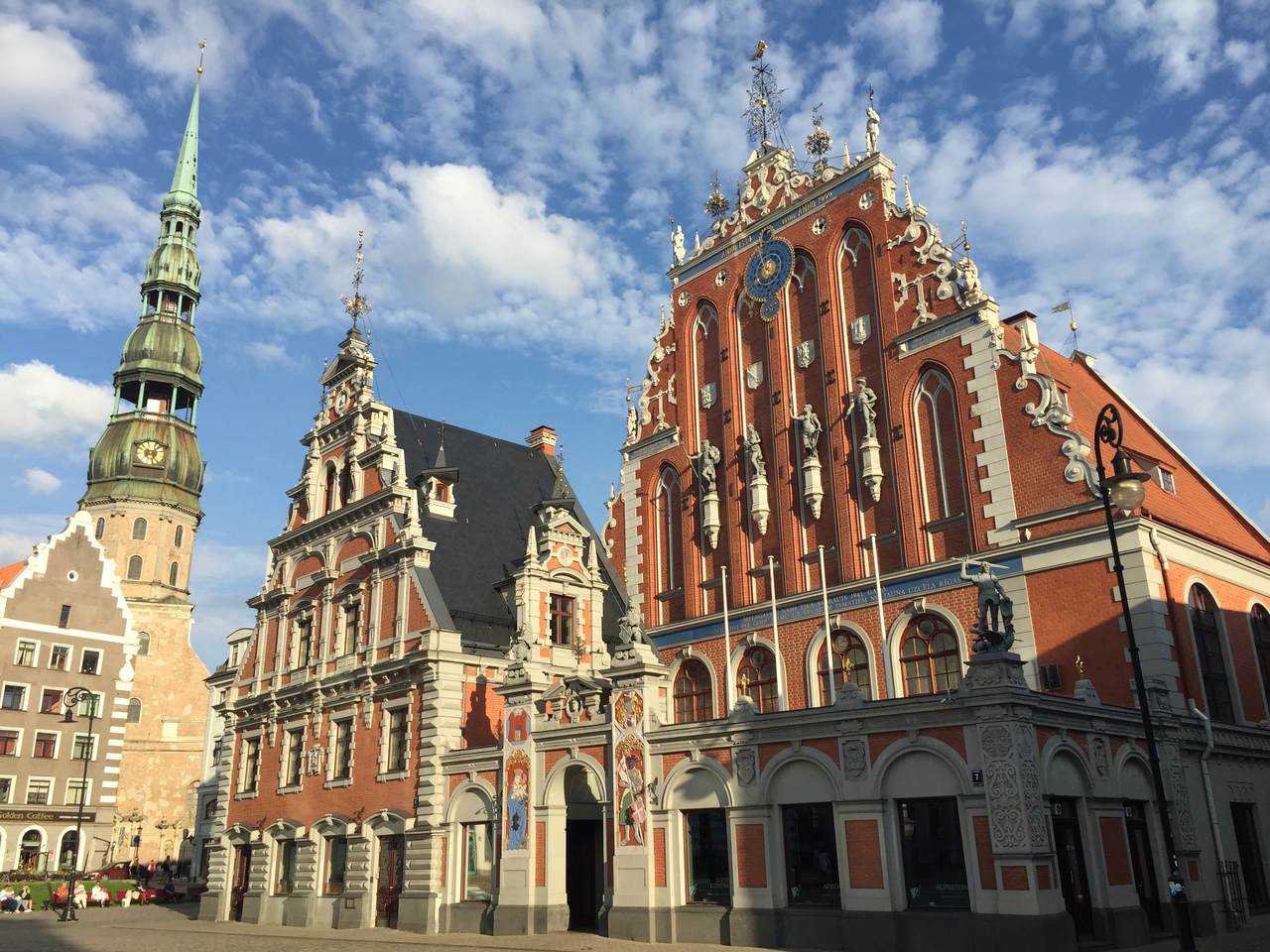 この会館は、第二次大戦で破壊されましたが、建国800年を機に再建されて今に至ります。彫刻や青くて大きな時計が印象的です。時計の下にある4つの都市の紋章があります。当時のハンザ同盟国であり、左からリーガ、ハンブルグ、リューベック、ブレーメンです。