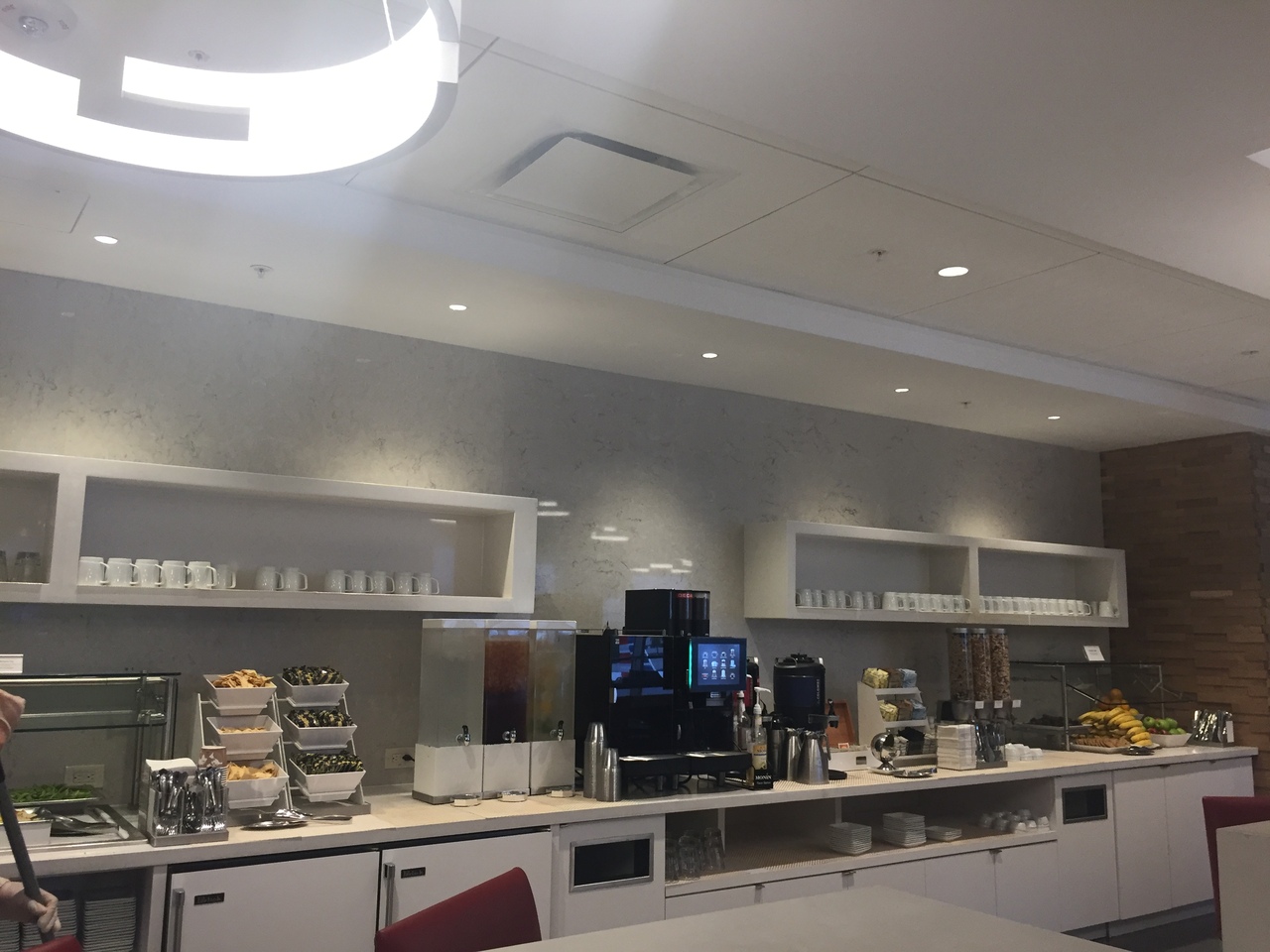午前11時すぎると軽食のメニューがシリアルから変わっていました。バーニャカウダ、サラダ、野菜チップ、野菜のスープ、リンゴなどでヘルシー志向。人参は生でそのままの形で置いてありました。軽食の種類は多くはないですが、なかなか広くて静かなラウンジでした。