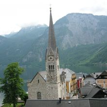 美しい湖の街ハルシュタットのなかで一番目立つ塔を持つ教会です。雄大な自然の風景の中で良いアクセントになっています。観光としてはすぐ近くにあるカトリック教会の方が、納骨堂などがあり面白いと思いますが、街の風景としてはこちらの教会の方が絵になっています。